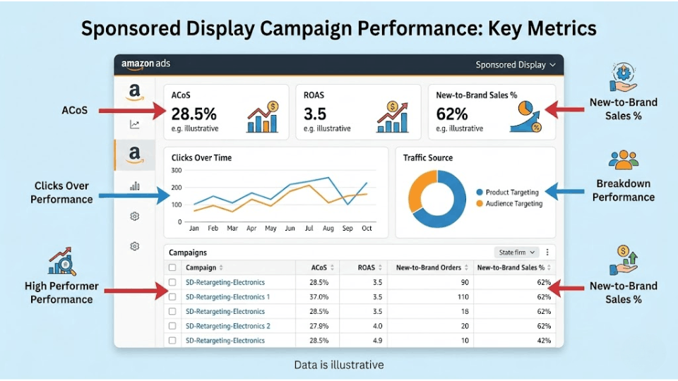 Sponsored Display often works higher in the purchase funnel than Sponsored Products. ROAS may look lower on paper, but the ad is doing different work — building awareness, driving new-to-brand traffic, and retargeting lost shoppers. Kavita Menon from Chennai paused her SD campaigns after just 10 days because ROAS didn't match her SP benchmarks. Six months later, she relaunched with realistic expectations, gave campaigns 30 days, and discovered SD was driving 22% of her new customer acquisition.