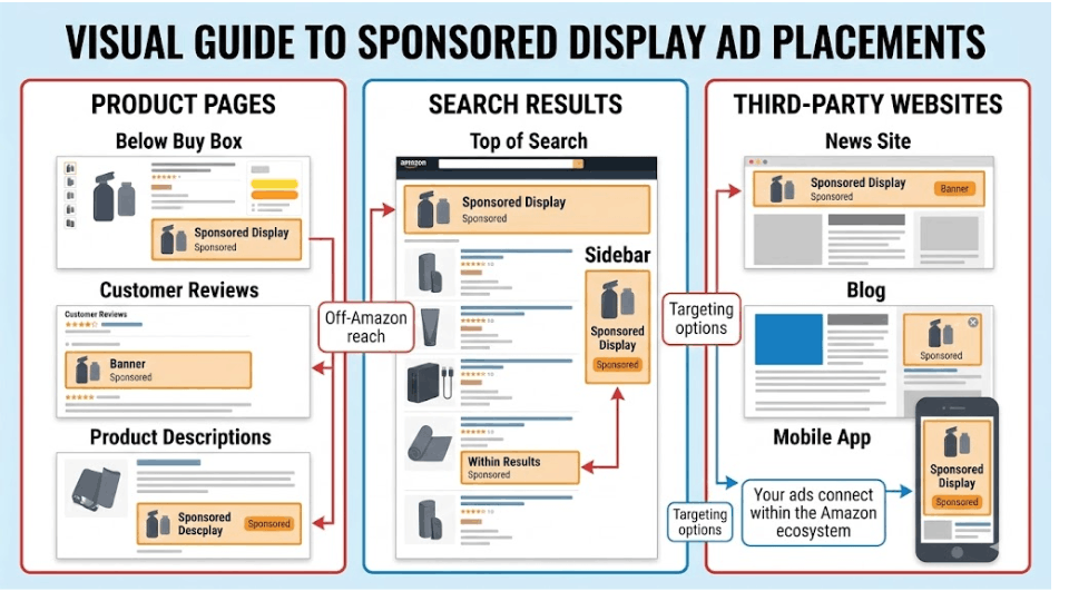 Sponsored Display ads appear on product detail pages, customer review pages, search results pages, and the Amazon homepage. They also show on Amazon-owned properties like Twitch and IMDb, and across thousands of third-party websites and mobile apps.