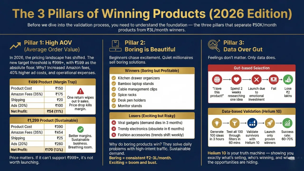 Before we dive into the validation process, you need to understand the foundation — the three pillars that separate ₹50K/month products from ₹3L/month winners.