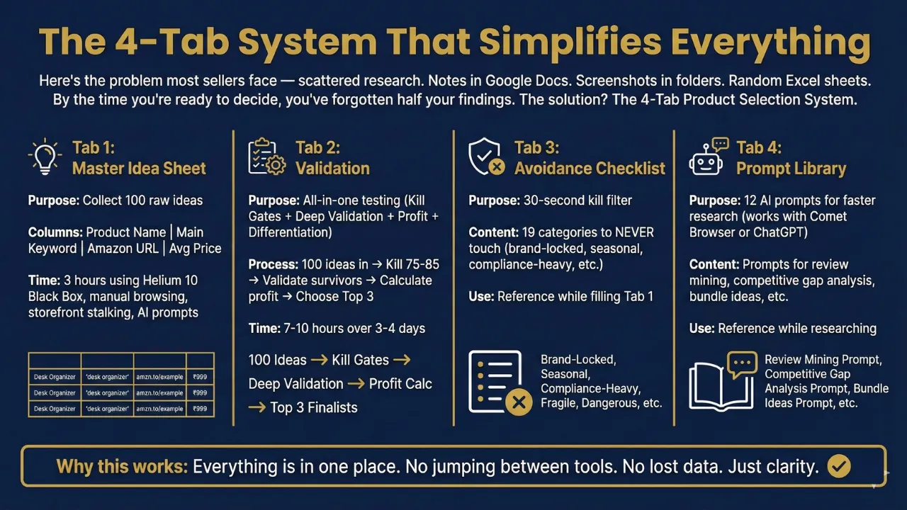 Step 3: Start with 10 ideas. Don't aim for 100 on Day 1. Pick 10 products you're curious about. Run them through the Kill Gates. See what survives. Get comfortable with the tools.