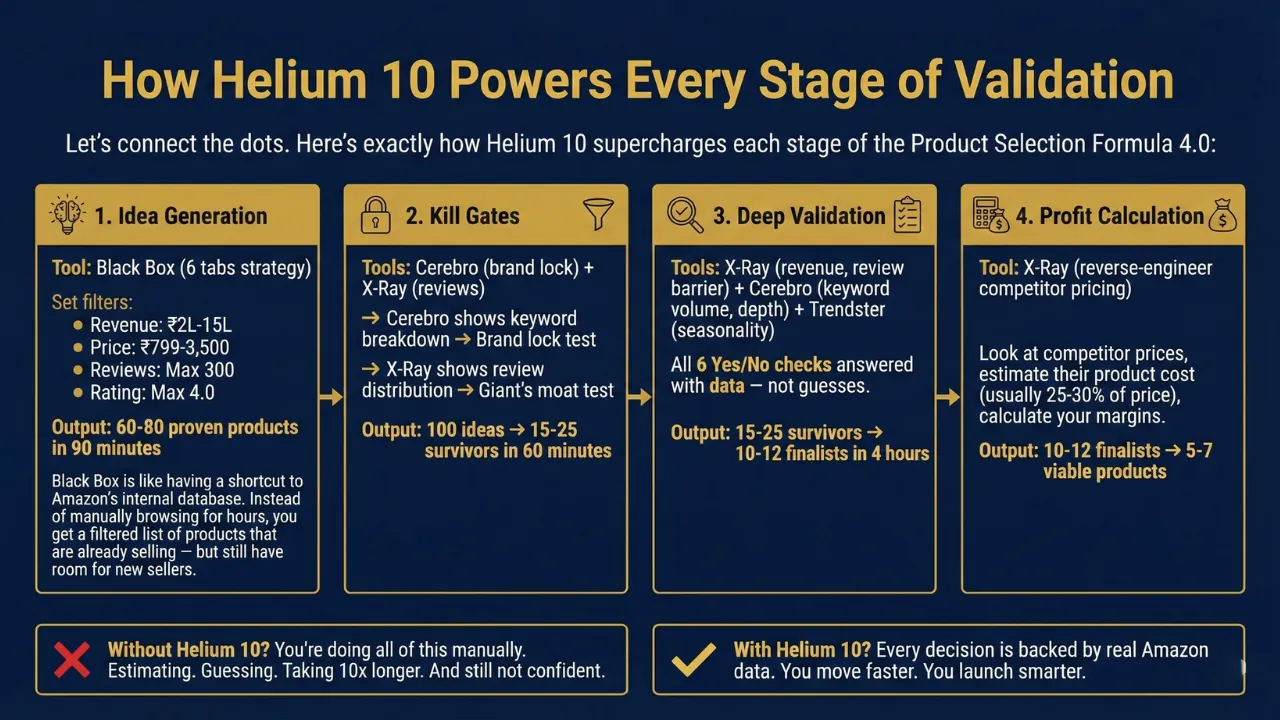 Absolutely. The cost of launching one wrong product (₹2L loss) is 40x the annual cost of Helium 10. It's insurance against failure. Plus, the data you gather helps with pricing, keyword optimization, and competitive analysis — not just product selection.