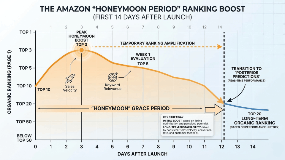 The honeymoon period typically lasts 15 to 45 days depending on category. Use it by having your listing fully optimised, PPC campaigns live, and review generation active from day one. The algorithm evaluates your early performance to decide long-term ranking, so front-loading effort during this window builds the strongest foundation.