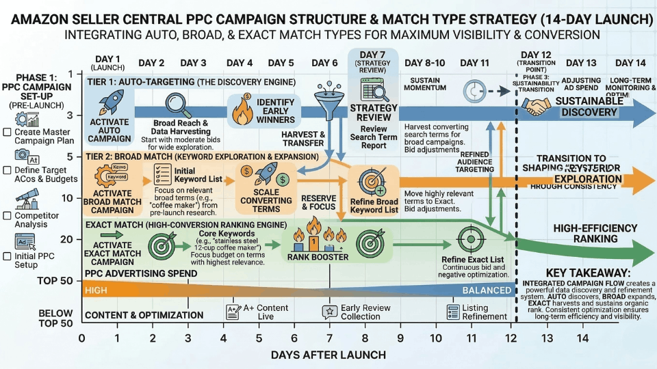Day one is for your auto campaign — let Amazon discover relevant keywords. On day two, launch a broad match manual campaign targeting 15 to 30 keywords. By day three, set up an exact match campaign for your top five to ten high-intent keywords. Allocate roughly 70% of budget to Sponsored Products and set bids 10 to 15% above Amazon's suggestion. This is not the time to be conservative — the algorithm is watching how aggressively you compete for visibility in these early days. If you want a deeper breakdown of this exact structure, our guide on launch PPC campaigns you need walks through each step.