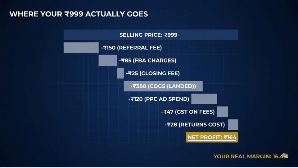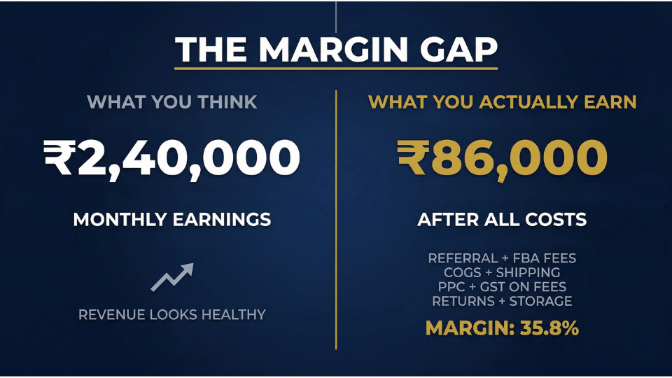 Last November, Dilip Chandra from Ahmedabad pulled up his Seller Central dashboard and smiled. His monthly revenue had crossed ₹8.5 lakh for the first time. He assumed business was booming. Then his CA asked him to actually trace every rupee, and the picture changed entirely. After accounting for referral fees, FBA charges, return costs, ad spend, and GST on platform fees, Dilip's real take-home was under ₹90,000. More than 89% of his revenue had vanished into costs he had never tracked in one place.