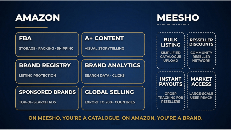 Those Meesho advantages sound attractive, but they come with a trade-off. Meesho gives you reach. Amazon gives you a business. The difference is significant. Amazon offers Fulfilment by Amazon, the Prime badge, A+ Content, Brand Registry, Brand Analytics, Sponsored Brands, and the ability to sell globally through Amazon Global Selling. None of these exist on Meesho. If you want to build a brand that customers recognise, trust, and return to, Amazon is the only platform in India that gives you the full toolkit to build a strong brand.
