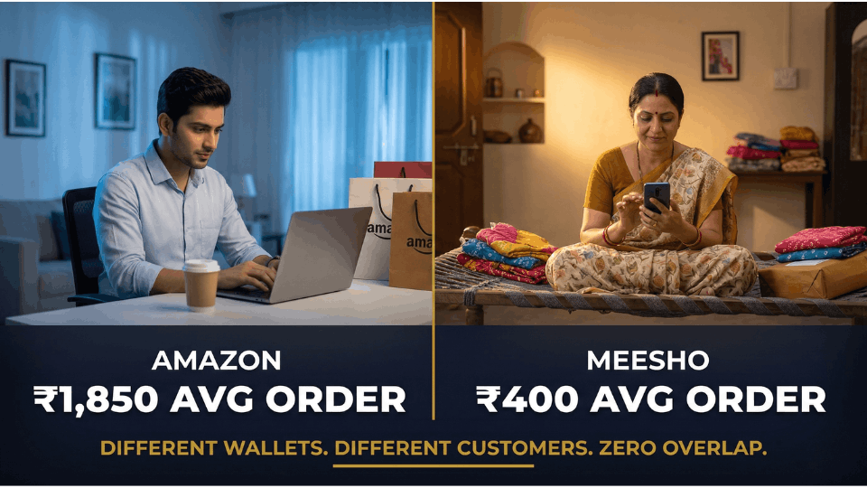 Last November, Kunal Sharma from Nagpur logged into his Amazon Seller Central dashboard and noticed something unexpected. His ethnic kurta line was doing well on Amazon, pulling in steady orders at an average price of Rs 1,200 per piece. But his cheaper, unbranded cotton kurtas priced under Rs 400 were barely moving. A friend suggested listing those budget products on Meesho. Within three weeks, Kunal was selling 80 units a day of those same kurtas on Meesho, to a completely different set of buyers from tier-3 towns he had never reached before. His Amazon store stayed untouched. No cannibalisation. Just two platforms, two audiences, and a wider net.