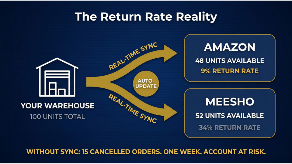 The moment you list the same stock on two platforms without a sync system, you are walking into a trap. Imagine you have 50 units listed on both Amazon and Meesho. Both platforms sell 30 units in a day. You now owe 60 units but only have 50. The result is cancelled orders, penalties on Amazon, and a hit to your account health metrics. Amazon takes account health seriously. A spike in cancellations can trigger warnings or suspension.