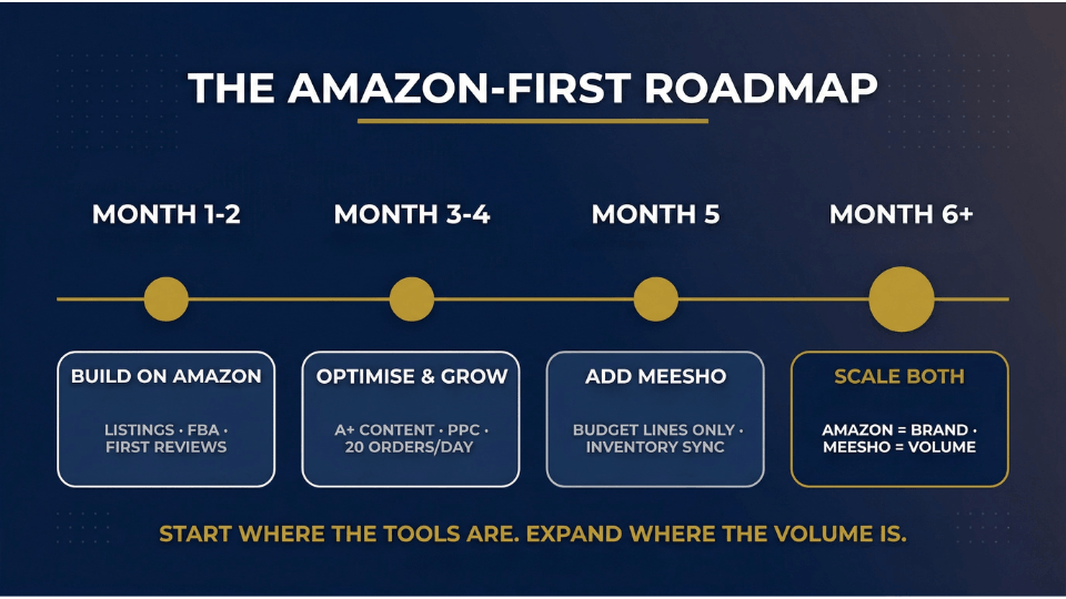 The biggest mistake sellers make is starting on Meesho because it is easier and then trying to move to Amazon later. It should be the other way around. Build your brand on Amazon first. Perfect your listings, establish a reliable supply chain, get your FBA operations running smoothly, and build a review base that gives customers confidence. Once your Amazon business is stable and profitable, duplicate your budget product lines to Meesho for incremental volume.