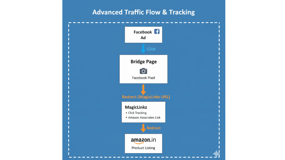 Use three layered methods: a bridge page with Facebook Pixel or Google Tag to optimise ads, Amazon Associates tracking links to measure actual purchases, and MagicLinkz for click tracking and retargeting pixels. Combining all three gives the most complete picture available to Indian sellers.