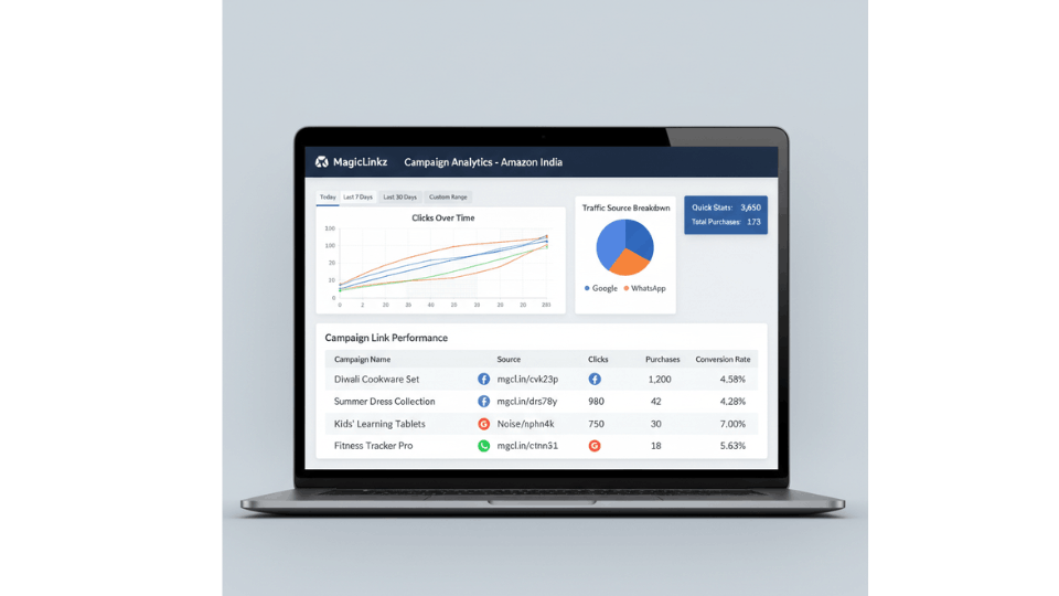 MagicLinkz is a smart link tracking tool built specifically for Amazon sellers in India. It creates Amazon URLs with your target keyword embedded, following the search-find-buy approach that helps Amazon associate your listing with specific search terms. Every click on a MagicLinkz link is tracked in a dashboard, giving you visibility into click volume by link, by day, and by source. You can create separate links for Facebook, Instagram, YouTube, WhatsApp, or any other platform and compare performance side by side.