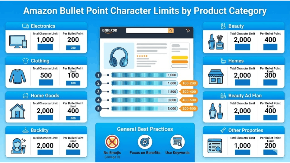 Not all categories play by the same rules. Apparel listings often cap at 100-150 characters per bullet, while electronics may allow up to 500. Always check your Category Style Guide in Seller Central before writing.