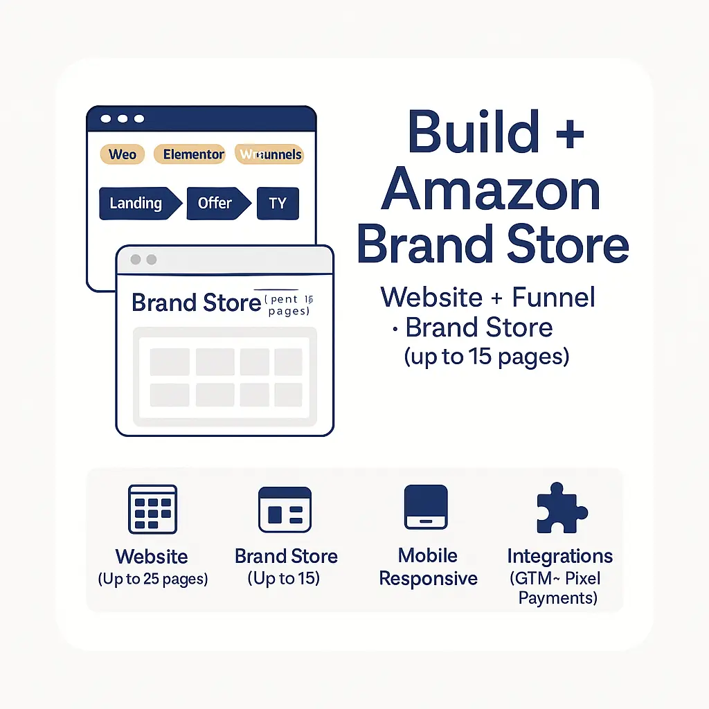 Everything in the Website/Funnel Build plan plus a complete Amazon Brand Store (up to 15 pages) designed and published in Seller Central. Includes store navigation, tile layout, submission for Amazon review, a Loom walkthrough, and one consolidated revision. Typical delivery: 7–10 business days for site/funnel + up to 5 additional days for Brand Store (after assets & approvals). Brand Registry required.