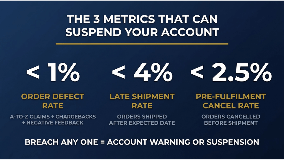 Amazon tracks three critical seller performance metrics, and breaching any of them can lead to account suspension. Your Order Defect Rate must stay below 1%. This includes A-to-Z Guarantee claims, chargebacks, and negative feedback. Your Late Shipment Rate must remain below 4%. And your Pre-Fulfilment Cancel Rate needs to stay under 2.5%. For a new seller with a handful of orders, the math is unforgiving. One defective order out of five means a 20% defect rate, which triggers an immediate warning. If you want to understand how to avoid common Amazon policy violations, that guide covers the full picture.