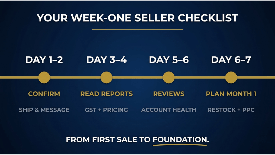Your first sale on Amazon is proof that someone wants what you are selling. But the real work starts in the seven days that follow. Confirm and ship fast on day one. Read your reports by day three. Request a review by day five. Audit your account health by day six. Plan your first full month by day seven. Every step in this checklist exists to protect your account and build momentum.