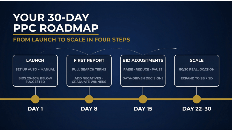 This post gives you a day-by-day plan for your first 30 days of Amazon PPC. A specific framework for how much to spend, what bids to set, when to adjust, and what to leave alone.