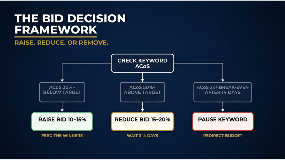 With two weeks of data, you can make informed adjustments. If a keyword converts at an ACoS 30% or more below your break-even, raise the bid by 10 to 15%. If a relevant keyword gets few impressions despite a reasonable bid, bump it by 15 to 20%. Your Amazon PPC bidding strategy here is about feeding winners, not exploring new territory.